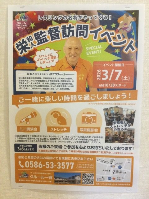 レスリングの名将、栄和人(さかえかずひと)監督をゲストにお迎えした交流イベントを、2026年3月7日土曜に、弊社のグループ会社である介護事業の株式会社クルール尾張が運営する「クルール一宮」、「クルール津島」、「クルール津島江西」の3施設にて開催いたします。クルールでは、施設のご入居者様だけでなくそのご家族や知人の方たちも一緒に楽しめるイベントを定期的に開催しており、この度クルールのスペシャルイベントとして、かねてより弊社と交流のあるレスリングの栄監督をお迎えし、ミニ講演会やストレッチ運動などを楽しめる内容で企画いたしました。クルールグループは入居者様の明るい生活を支えると共に、地域福祉に貢献すべく活動してまいります。