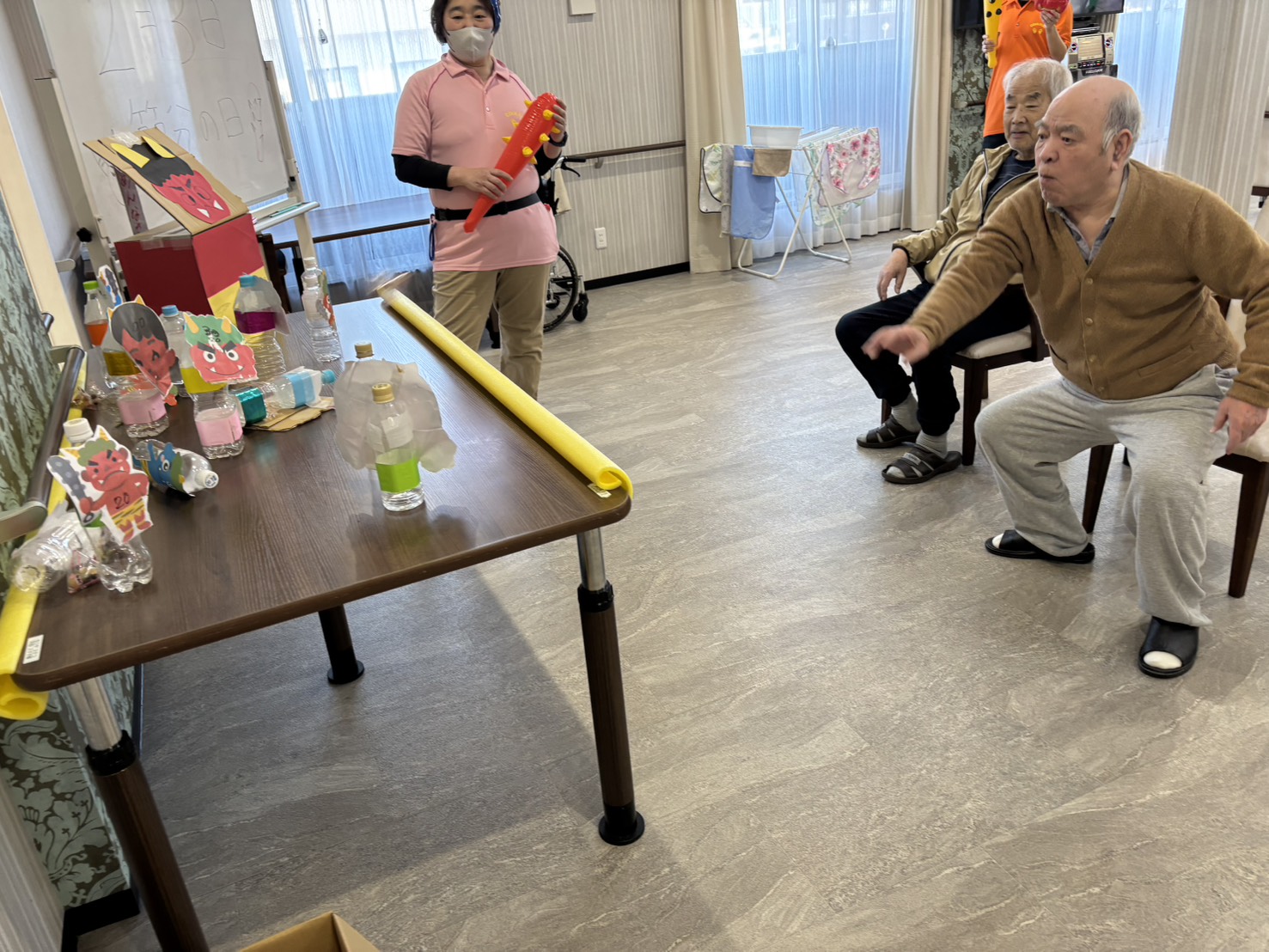 ペットボトルに鬼の絵を貼って並べて